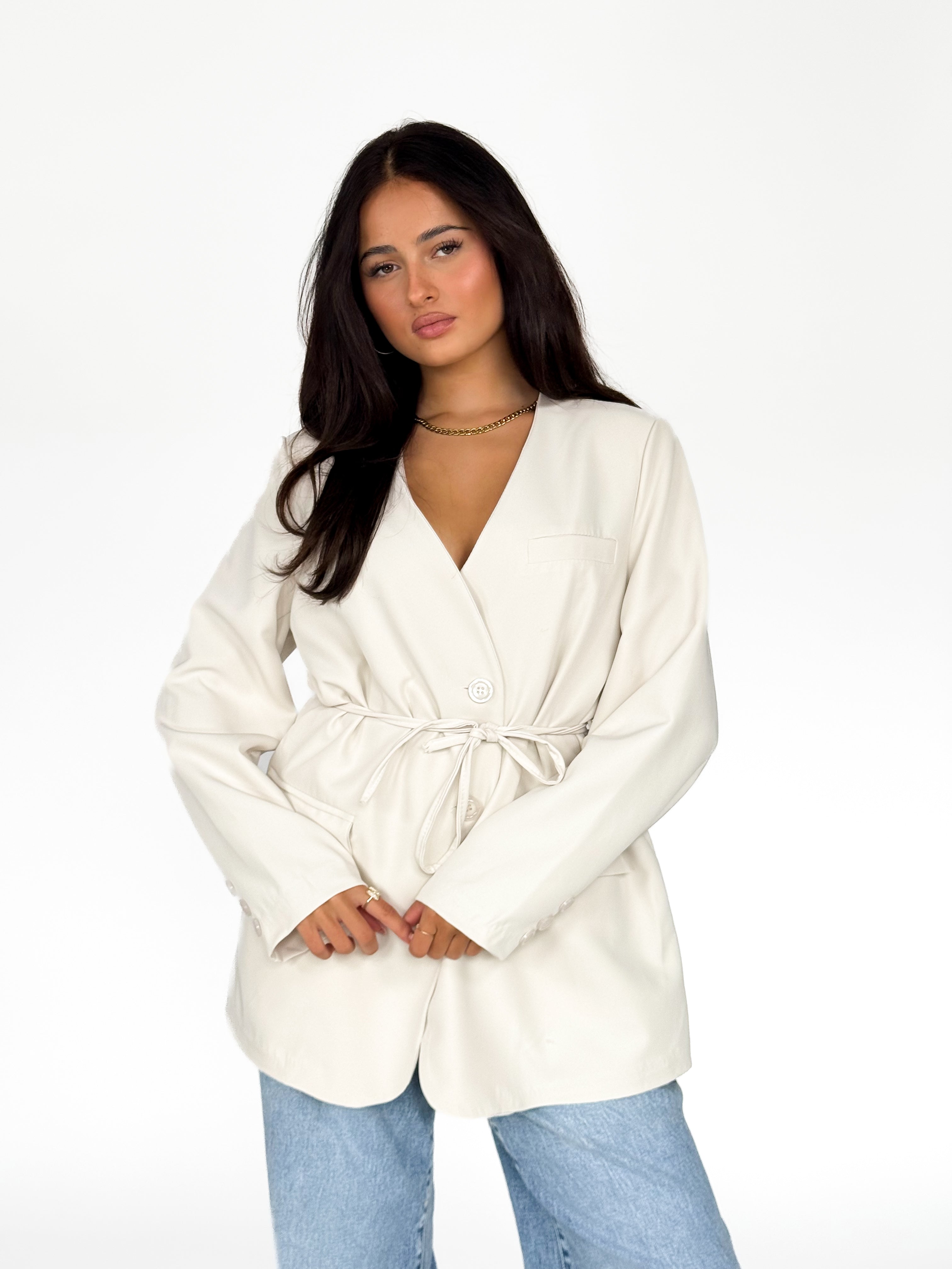 Your new favorite blazer is here! De Julia blazer is de perfecte blazer voor elke gelegenheid! Van school en werk tot een avondje of dagje uit, de opties zijn eindeloos. De blazer sluit aan de voorkant met twee knopen en heeft een strikbandje waarmee je de blazer getailleerd kunt maken. De blazer heeft een V-hals, is gevoerd, heeft schoudervulling en onderaan de mouwen zitten drie knoopjes. Ook heeft de blazer twee functionele zakken aan de voorkant. Stijl de Julia blazer met de bijpassende pantalon of ga voor een meer casual look door met een van onze (stretchy) jeans te dragen.