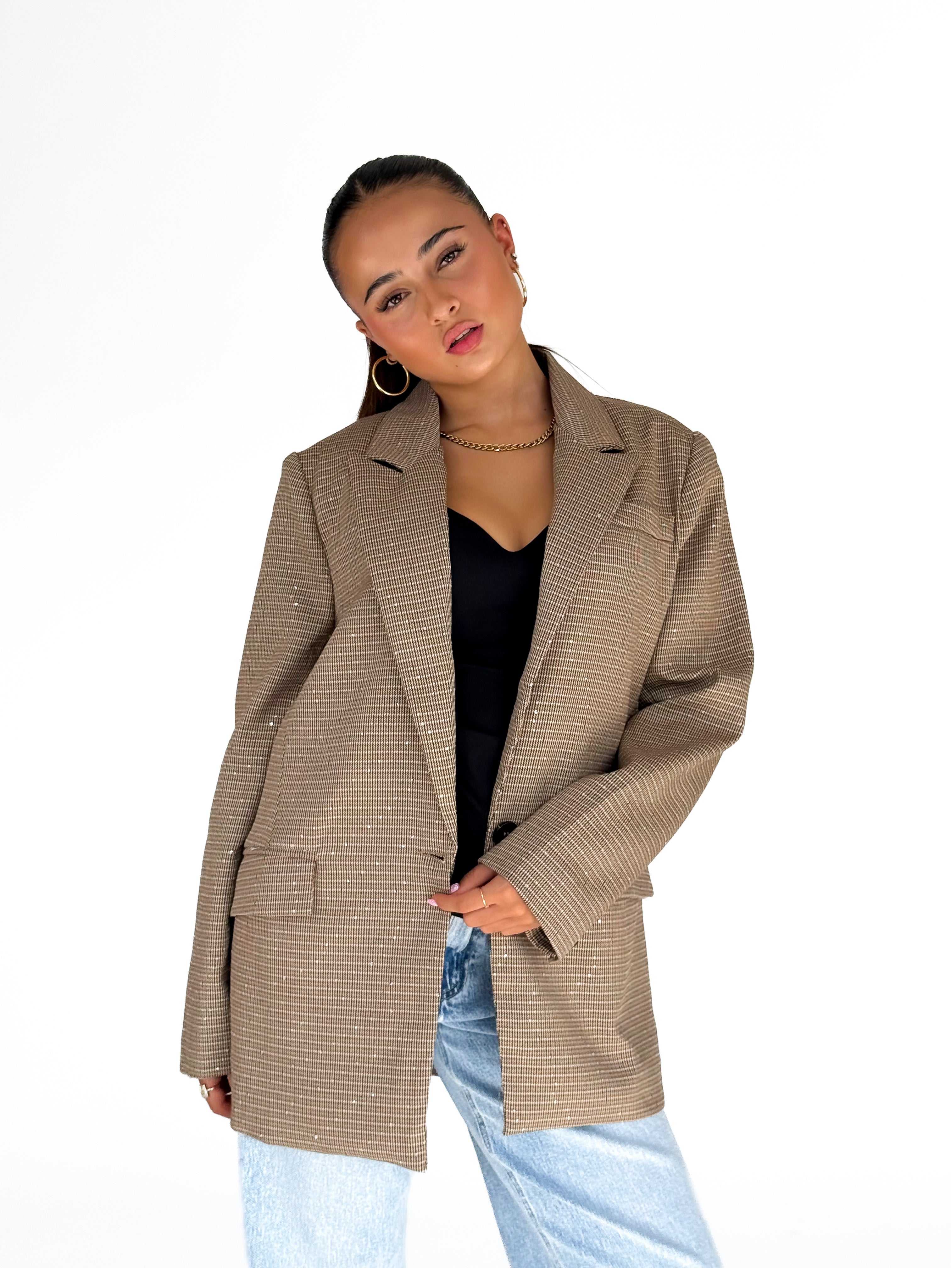 Beschrijving: The perfect fall blazer! De Lizzy blazer is de perfecte blazer voor de herfst met een touch of glitter! De blazer valt oversized, heeft schoudervulling, heeft een ruitjespatroon en bevat kleine glitters.