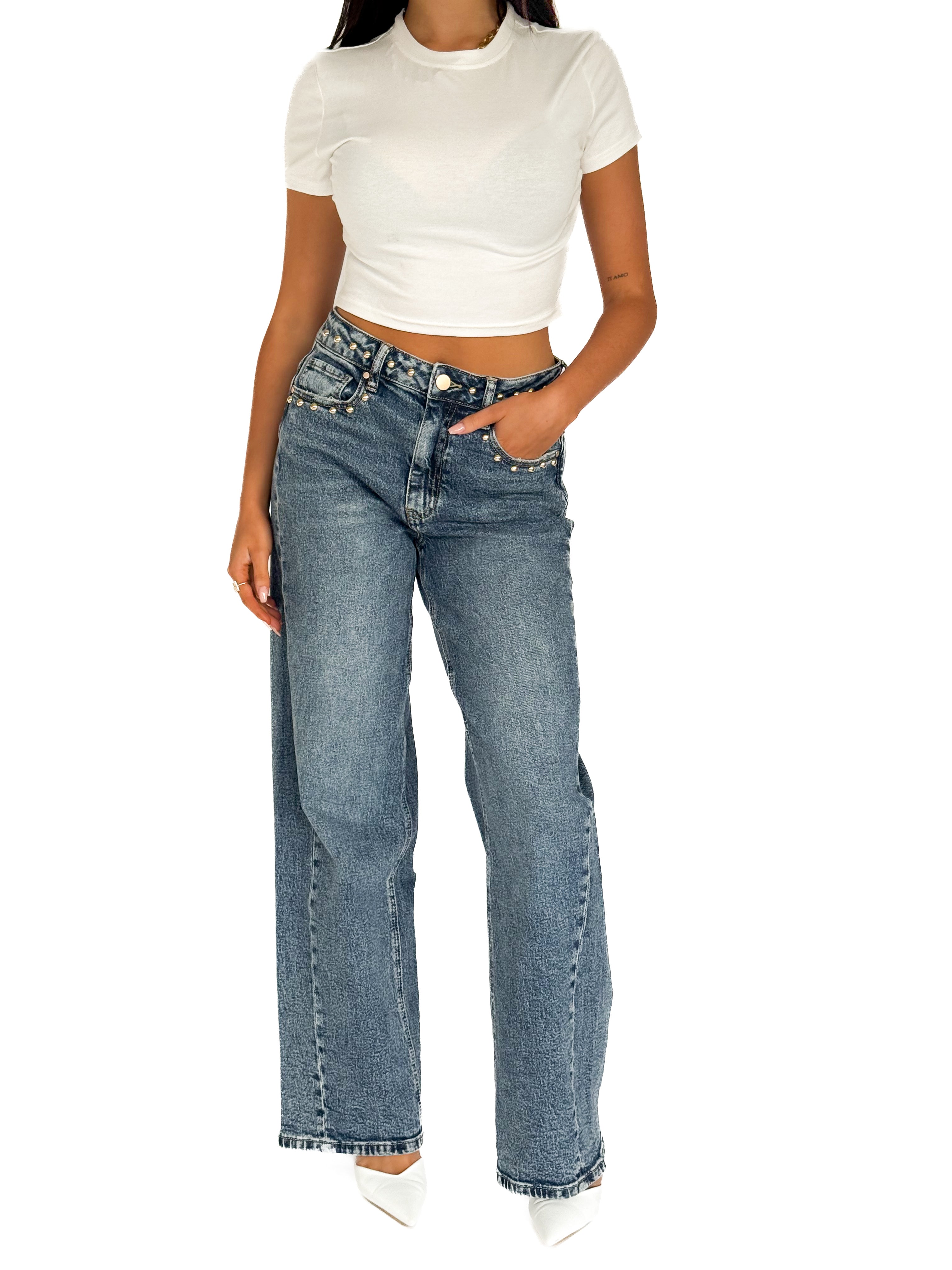 De Romy wide jeans is dé perfecte stretchy jeans die je in je kast wilt hebben: cool, stylisch en comfy. De Romy wide jeans is high waist, heeft een dark denim kleur, wijde pijpen. De broek heeft super leuke gouden studs aan de bovenkant, wat de jeans nog wat leuker maakt! Dankzij de stretch zit hij super comfortabel en sluit de jeans mooi mooi aan. ✨👖