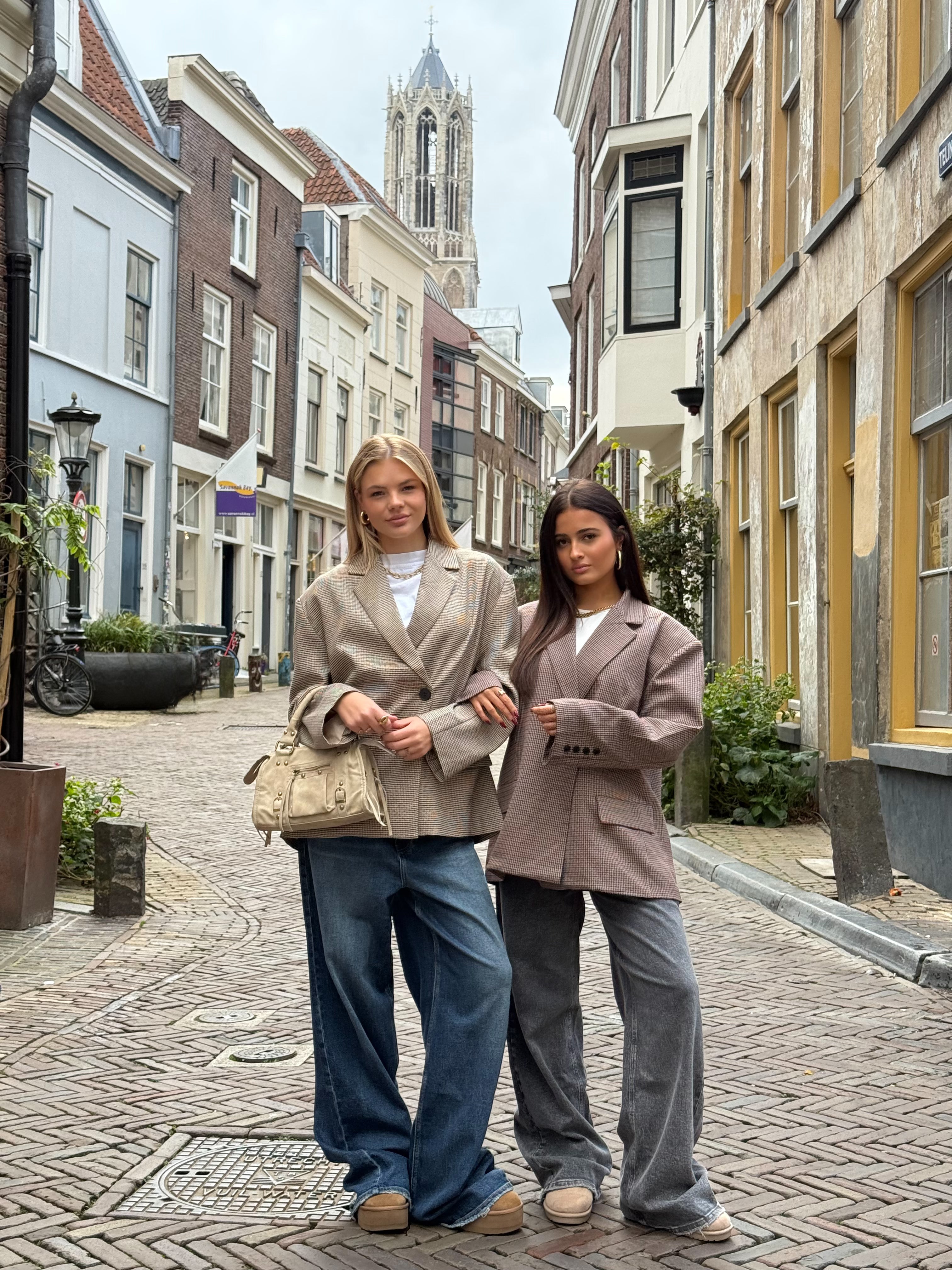 Model Mila (blond) is 1.73m en draagt maat 38 voor een baggy fit.